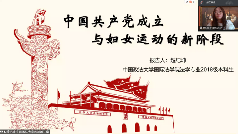 越纪坤同学作了题为《中国共产党成立与妇女运动的新阶段》的读书分享。她详细介绍了中国共产党的诞生历程,并从历史发展的趋势下阐述了中国共产党诞生的必然性。解读了中国共产党的诞生如何将妇女运动推向新阶段,并结合视频介绍了妇女运动的影响。中国共产党将妇女运动纳入反帝反封建运动的轨道,为中国妇女解放乃至中华民族的解放提供了强大的助力。