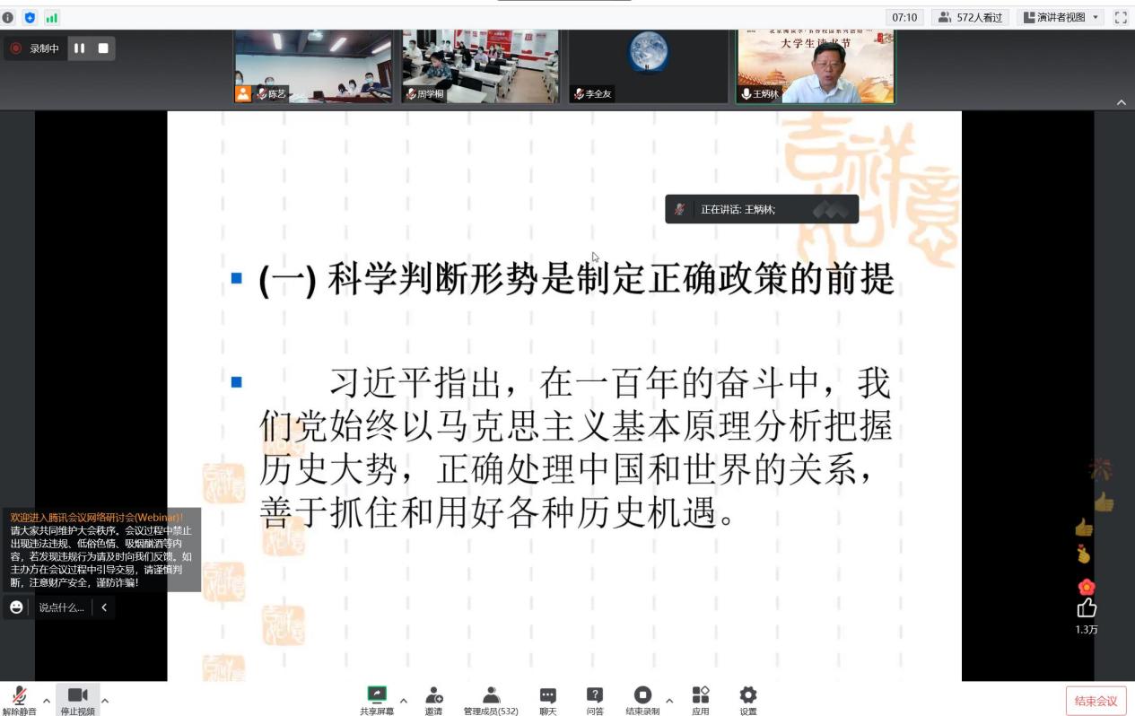 在最后的线上问答环节,王炳林教授就“党史书籍有哪些推荐”、“党史学习教育如何落到实处、取得实效”等问题与参会师生进行了深入的探讨交流。讲座的最后,王硕代表与会师生对王炳林教授精彩的报告表示诚挚的感谢。