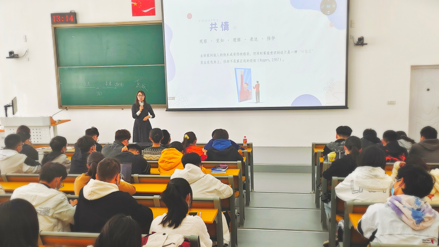 全体心理委员、宿舍长以及部分教师代表,分别在教一楼12阶梯教室和线上腾讯会议参会。讲座由本科2021级辅导员张欣烨主持。