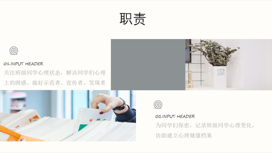 紧接着介绍了心理委员的职能,心理委员应关注班级同学心理状态,解决同学们心理上的困惑。做好示范者、宣传者、发现者,同时协助建立心理健康档案。