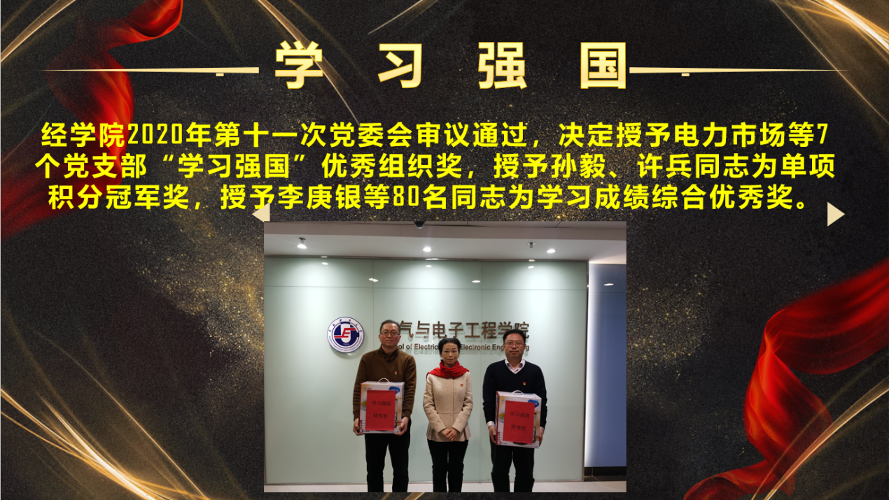 突出贡献奖。同时对“学习强国”学习情况予以表彰,授予电力市场等7个党支部优秀组织奖, 授予孙毅、许兵单项积分冠军奖,授予李庚银等80名同志学习成绩综合优秀奖。