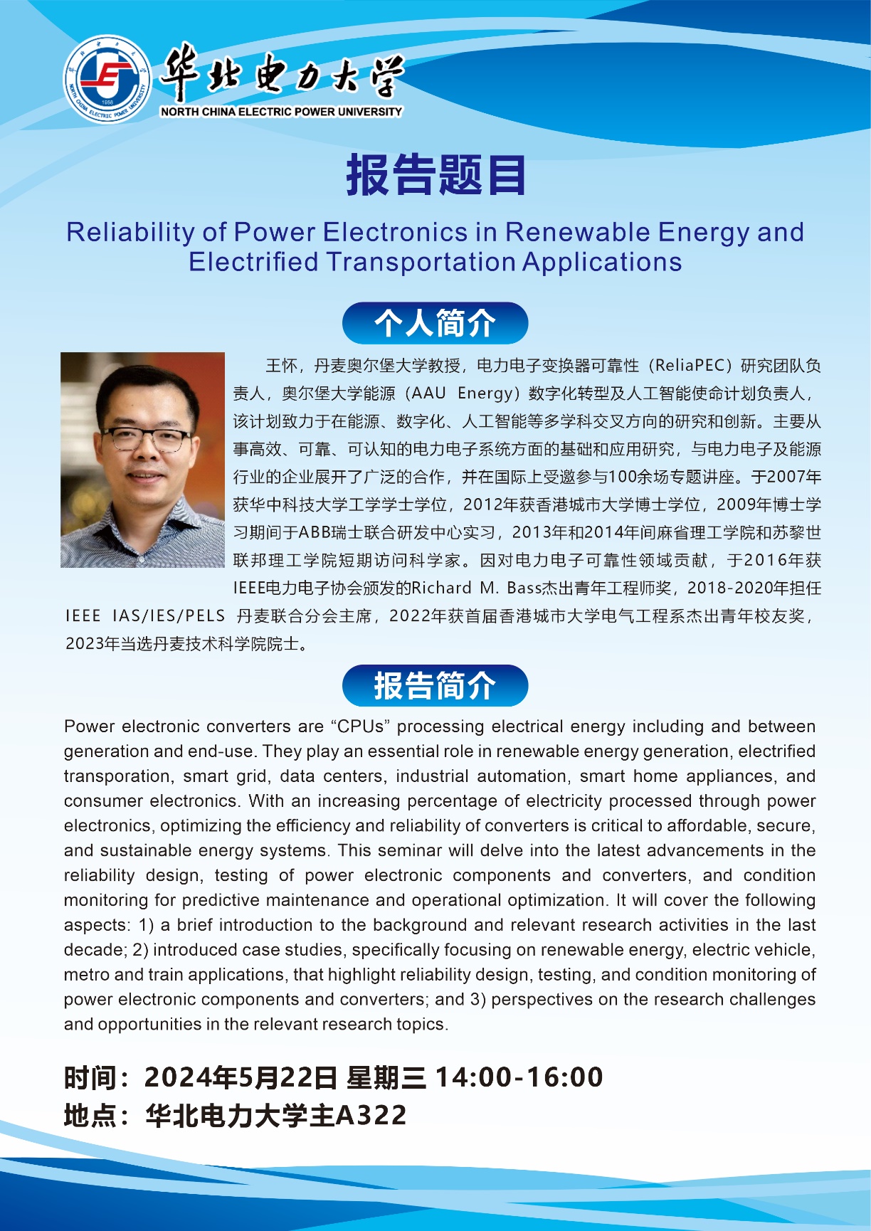 王怀,丹麦奥尔堡大学教授,电力电子变换器可靠性(ReliaPEC)研究团队负责人,奥尔堡大学能源(AAU Energy)数字化转型及人工智能使命计划负责人。
