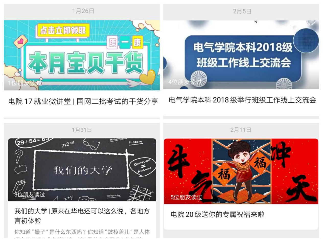 以年级和班级为单位,积极利用网络平台为同学提供服务和帮助,组织开展各类线上活动。本科2017级利用年级公众号,推出“电院17就业微讲堂”系列主题推送,邀请经验丰富的同学为大家分享备考国网、就业签约等相关经历,帮助学生更好地了解招聘信息和掌握求职技能;本科2018级举行班级工作线上交流会,辅导员、年级长、班长和团支书参会,各班充分总结了上学期各项工作,分享了工作经验,促进了班级之间互学互鉴,为下一学期的班级管理和建设打下更加坚实基础。本科2020级公众号开展了一系列趣味线上活动,如:春节vlog录制活动、各地方言体验活动等,给2020级的同学带来了一个充实丰富的寒假,加强同学互动交流,帮助同学更好地融入华电。