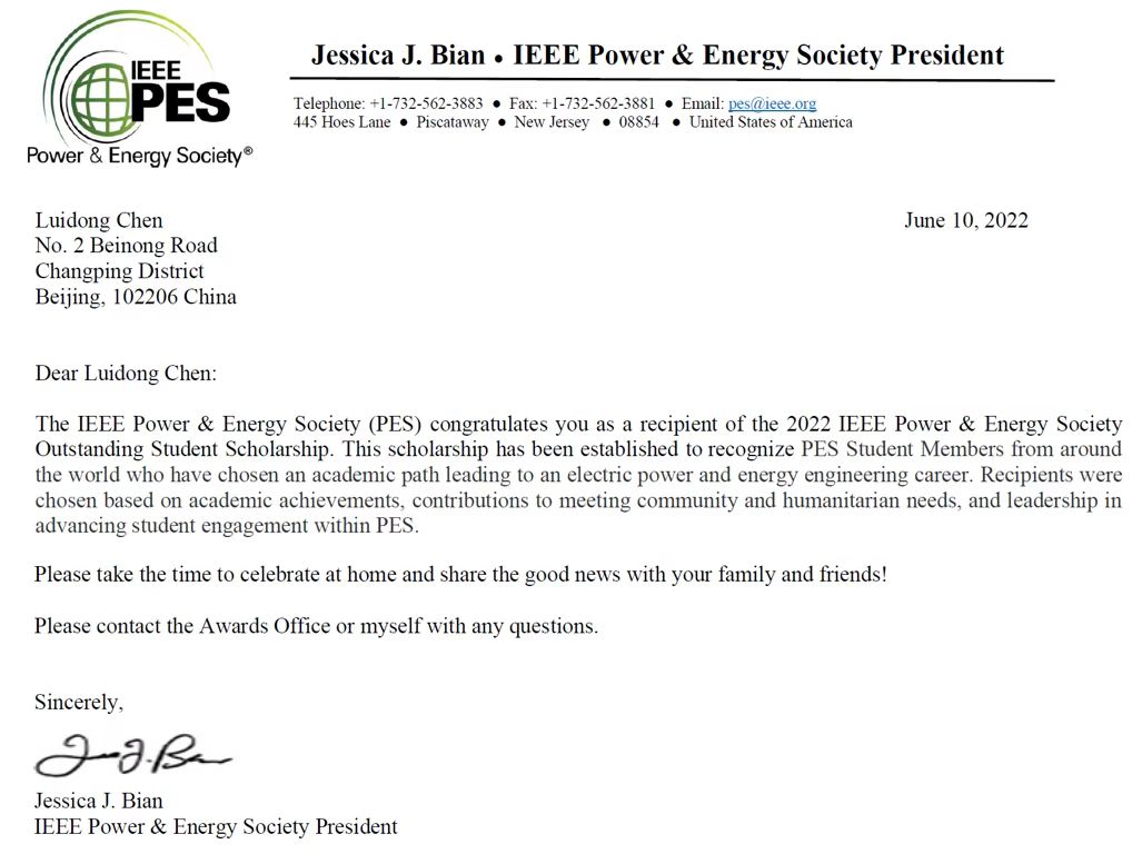 硕士生陈刘东因其优异表现获得2022年杰出学生奖学金(IEEE Power &Energy Society Outstanding Student Scholarship),成为我校首位荣获该奖项的学生。