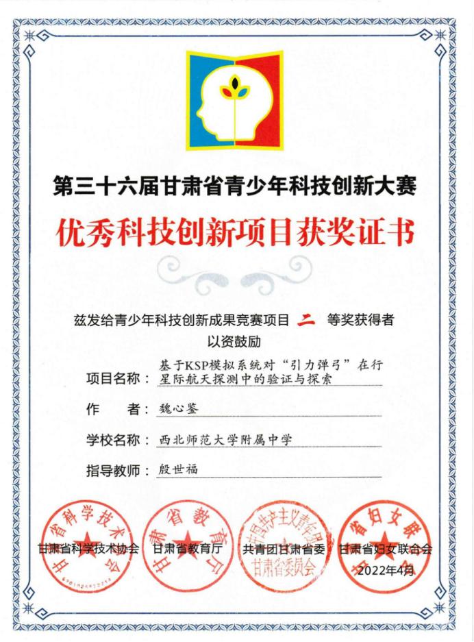人员的孜孜不倦、精益求精。他将这种精神化于学科探究之中,高二时看到第三十六届全国科创比赛的举办消息,他不假思索地报了名。面对科创大赛“创新度、实践度、精深度”的办赛理念,基于对航天的喜爱与相关专业知识,魏心鉴将自己的研究课题定为了《基于KSP模拟系统对“引力弹弓”在行星际航天探测中的验证与探索》。从调阅论文、查阅各国相关资料、设计测试方案、组织模拟测控网,到“引力弹弓”轨道设计、单个航天器的设计布局、发射,再到将笔下的轨道设计还原到模拟系统中、模拟各国有关探测器的变轨过程,魏心鉴全部自行完成,最后呈现出自己的课题报告并完成现场答辩,最终获评为省级二等课题。每当遇到艰深的理论或模拟中不测的意外,他也有过无从下手和迷茫彳亍。他热爱航空航天,不单单欣赏腾飞升空的绚丽和遨游天宫的浪漫,更感动于能让这些庞然大物如燕般翻飞的力量与精神。“从最小的旋翼机到偌大的空间站,工程师们能够将它们从图纸变为现实,从零件变为整体,从实验室走向空天,背后一丝不苟、尽善尽美的精神,不应该是每一个华电人应有的品质吗?”魏心鉴说出了他热衷科技创新的原因。他以华电甘肃省第一名的成绩进入糖心AV