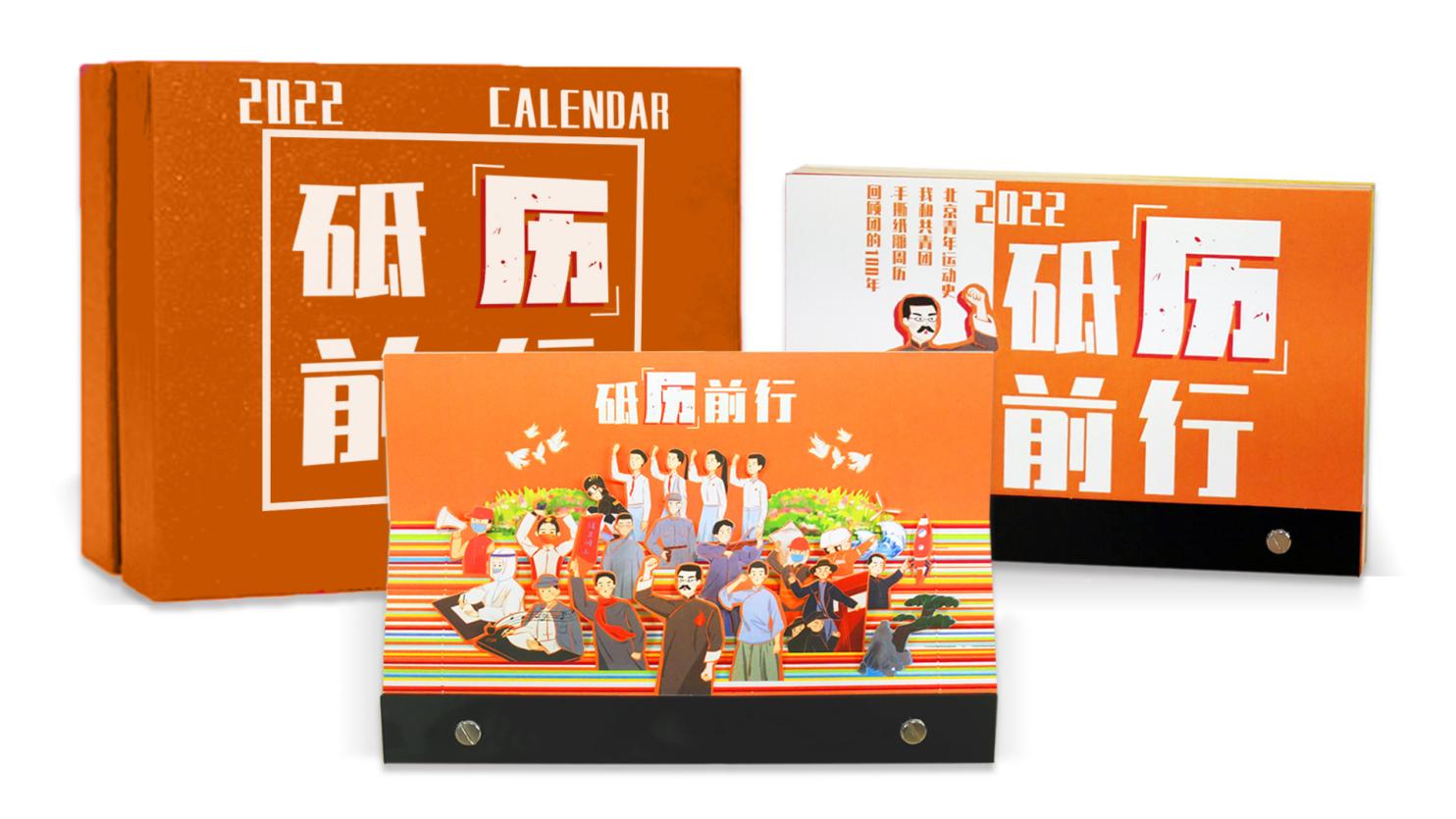 《砥“历”前行——北青群像立体纸雕周历》由立体纸雕、手绘内页和科技底座组成,既是实用周历、团史知识学习册,又可作为精美摆件,实现了功能性、教育性、原创性的统一,努力体现着“人文之心、艺术之眼、科技为体、商业为用”的设计理念。立体纸雕选取了从五四运动至建团百年杰出的代表青年人物,按历史脉络由远及近将人物排序,彰显青年奋斗精神代代相传的理念。周历内页设置“那年今日团史”专栏,从革命创制、学生运动等10 个方面,挑选了 10 个代表青年群像进行原创绘制和介绍。插画内页采用清新水彩半写实风格,增强视觉感知和产品美观性,扫描二维码即可获得更多科普文章和视频。周历底座融合科技创新,结合磁吸无线充电技术,凸显科技美感。通过功能拓创新拓展产品用途,突破传统周历一年限度的使用周期,贯彻了环保、节约的设计理念。《砥“历”前行》创意周历寓教于美,呈现了百年来青年人奋斗不息的蓬勃力量,希望为受众带来一“历”纵览团史长河的独特体验。