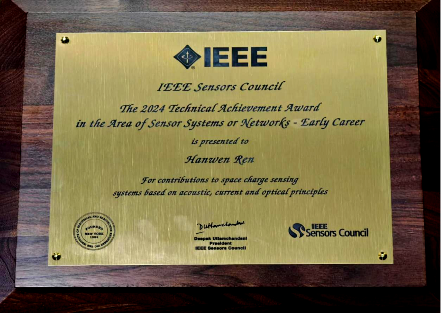 近日,IEEE传感委员会授予我院青年教师任瀚文2024年度青年学者技术成就奖(IEEE Sensors Council Technical Achievement Award-Early Career),用以表彰其在电绝缘空间电荷传感系统方面的贡献。IEEE传感委员会每年在Sensors和Sensor Systems两个方向于全球范围内各遴选1名获奖人,这也是该奖自2007年设立以来,首次颁给高电压绝缘领域的学者。
