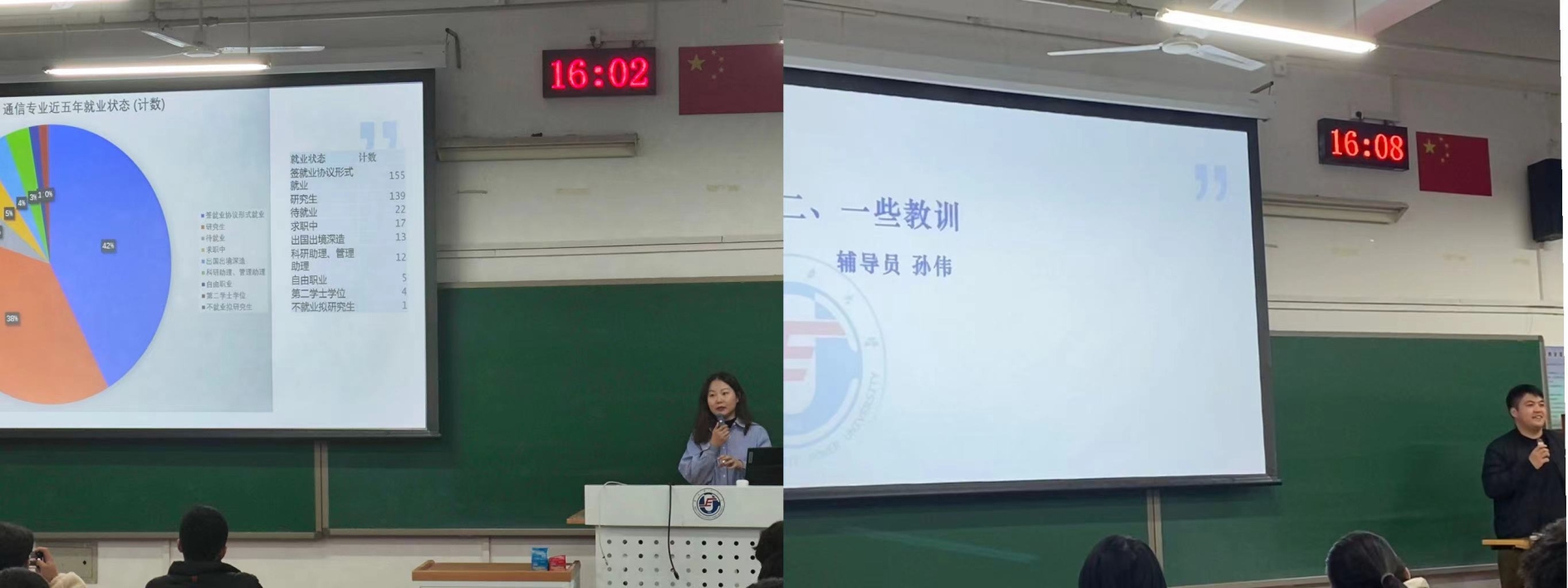 大会开始,张欣烨对近五年通信专业升学与就业情况进行了详细介绍,进一步帮助同学们做好生涯规划。关于考研,她指出备战是一个长期的、艰难的过程,需要同学们重视专业基础,保证身心健康,为最终“上岸”做足准备,同时希望同学们能够合理应对压力,如有需要及时向外求助。孙伟分享到,他人的学习计划不一定适用于自己,找到适合自己的方式;考研位于流感高发的季节,保证考研学习进度不被影响是需要面对的主要问题。