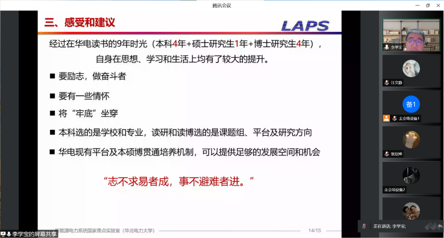 副教授李学宝作为首届实验班的受益者,将自己在华电九年的学业经历分成学习期、初探期、迷茫期、奋斗期四个阶段,向同学们介绍体会感悟。他提到,本硕博贯通培养不但能够激励自身积极进取,追求卓越,锤炼良好心态,而且是一个能为优秀的学生提供充足的发展空间和发展机会的平台。他鼓励同学们始终坚定不移的做一个励志者、奋斗者、情怀者,把握机会,借本硕博贯通培养之东风,明确规划,找准方向“将牢底坐穿”。