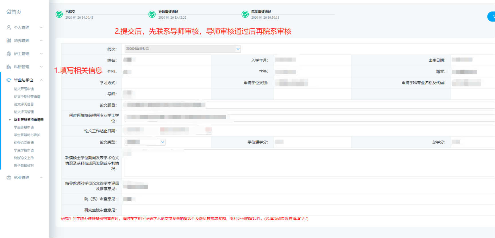 2、请打印《答辩资格审核表》,纸质版需要学生和导师签字(不方便,可以电子签)。纸质版《答辩资格审核表》提交截止时间:2020年5月20日之前。需通过导师的研究所统一交到研究生科A635。