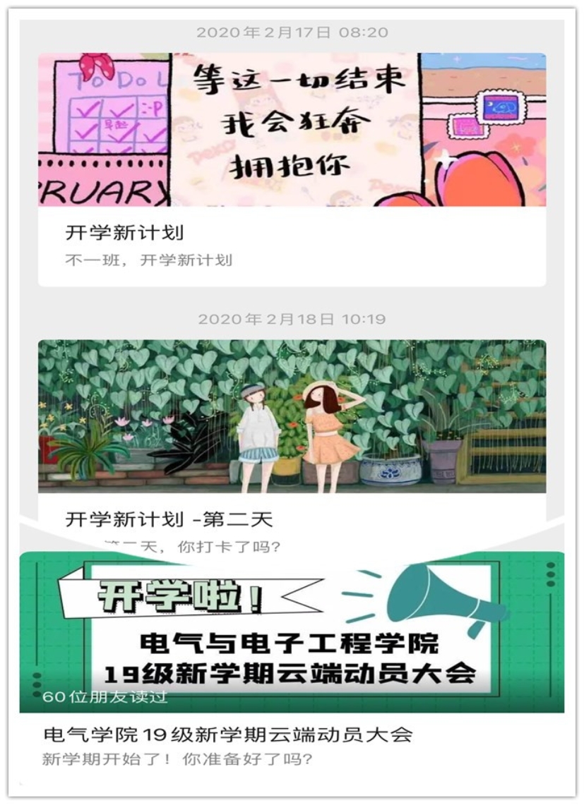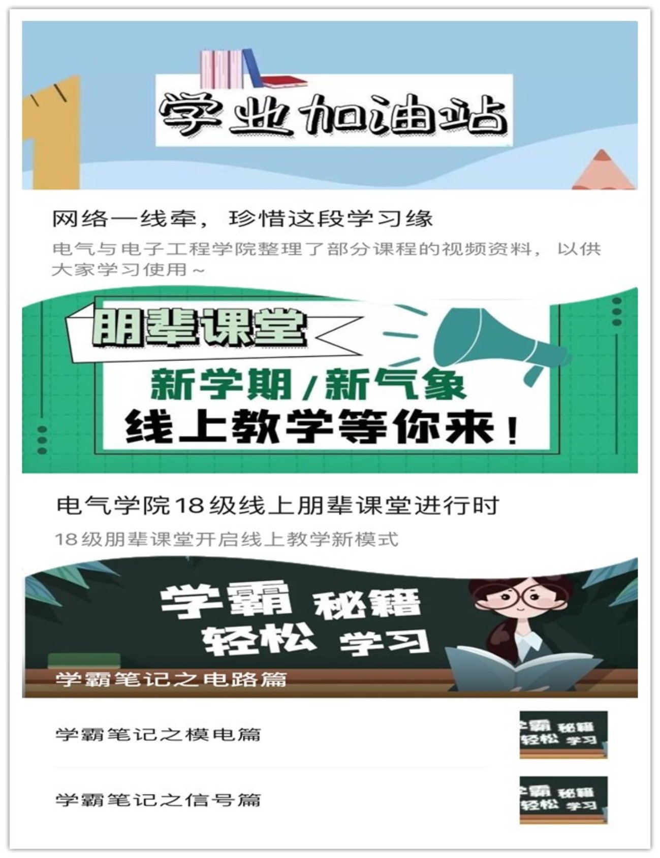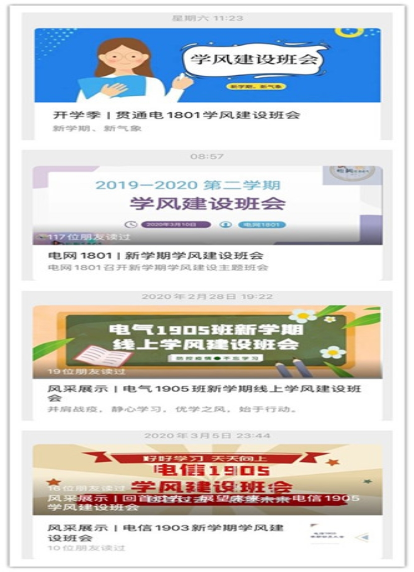 各年级将学风建设作为疫情防控期间的重点工作,开展了一系列形式多样、成效显著的促学助学活动,助力学生调整状态、收心归位,更好地适应线上教学,规划科学健康的学习生活。其中,电气1801班聚焦特殊时期同学们的不同需求,推出“开学新计划”特别企划,通过“课程学习”、“艺术拓展”、“运动健身”和“好书推荐”等多个模块,用轻松愉悦的形式向同学们提供特殊时期的学习生活指南,实现自主学习与身心健康双促进。2019级召开“新学期云端动员大会”,辅导员与各班学生干部共同回顾上学期的成绩与不足,横向对比分析各班成绩与表现,明确优势,找到差距,同时规划新学期的工作,做到“一班一策”助力线上教学,完成“停课不停学”期间的各项学习任务。各年级各班级召开线上学风建设主题班会,班主任带领学生进行学期总结、成绩分析、经验交流、制定计划等等,营造勤学上进的学习氛围。